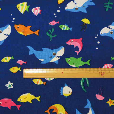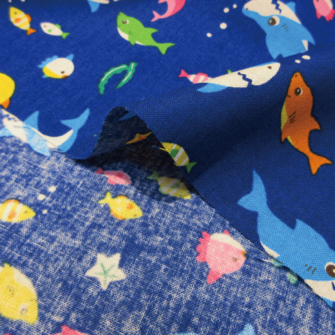 配送方法対応サイズ メール便個数1〜20 宅配便1個〜かわいいカラフルサメの家族柄の生地が入荷しました☆