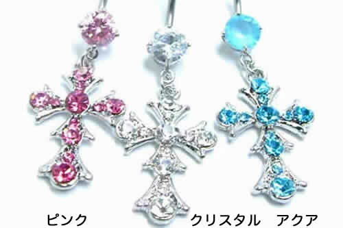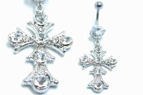 ジュエルを散りばめたクロスが神聖なイメージをかもし出す十字架へそピアス。