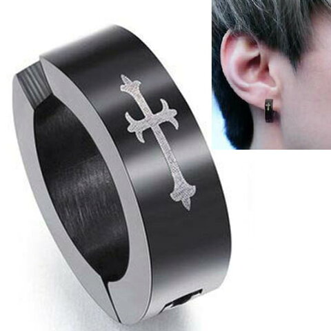 ブラックコーティングしたスタイリッシュなステンレスイヤリングにマッドゴールドの十字架が神聖なイメージをかもし出すイヤーカフ。