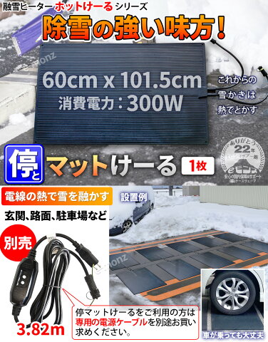 広範囲の設置はセット購入がお得です! お手頃で万能なケーブルタイプは屋根の除雪にも! 融雪ヒーター 停マットけーる 製品仕様 当社保証1年付き 面積 101.5cm x 60cm 重量 7kg マット内部温度 最高約40℃ 耐圧値 約4mpa (4メガパスカル) 防水等級 マット: IPX7 電源 約300W/100-120V(国内仕様) 電気料金(目安) 1日 約188円 ※24時間稼働の場合 ※全国の電力会社の平均 セット内容 融雪マット1枚、取扱説明書(日本語)
